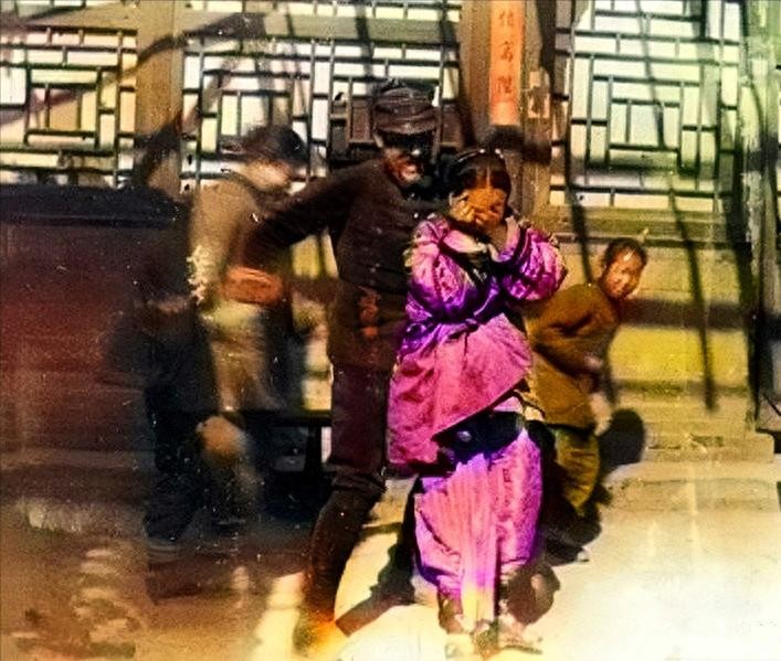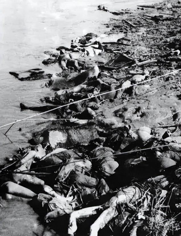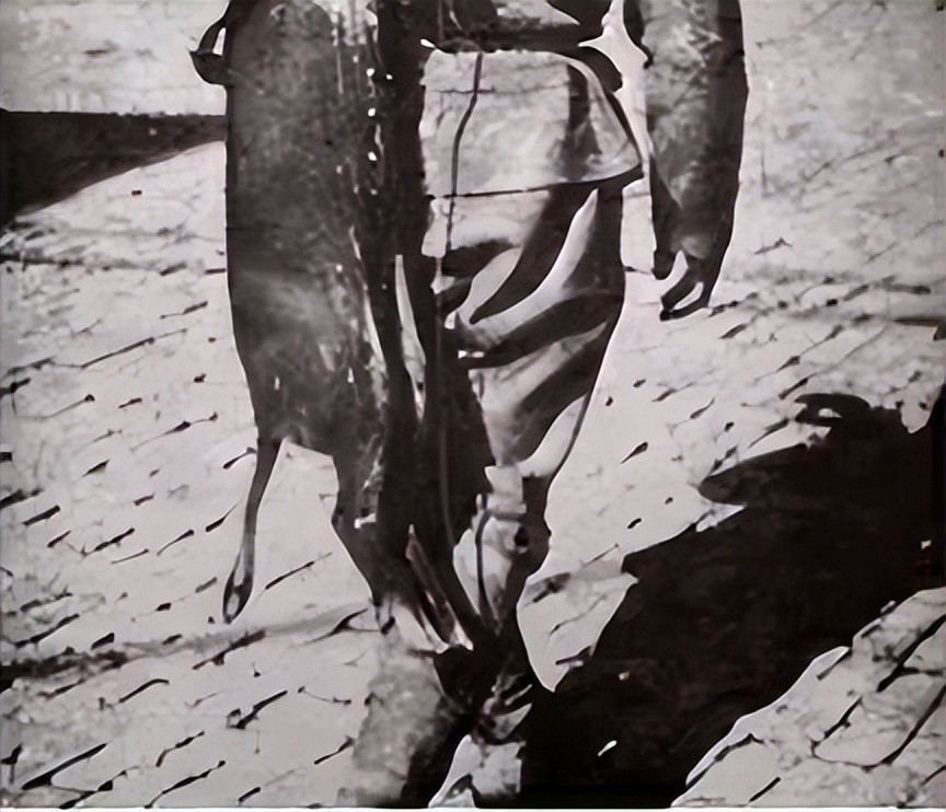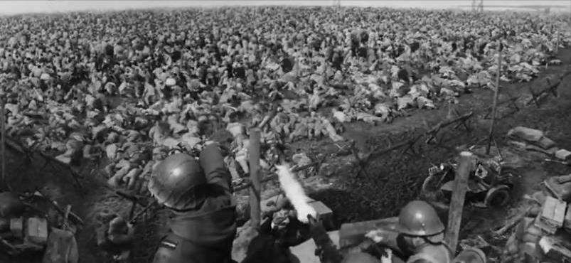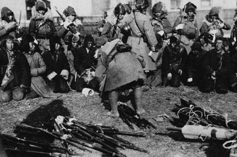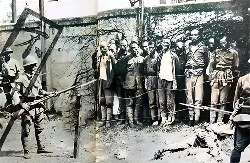 10、日寇拿着刺刀对着他们,看着架势,日寇是想对他们进行集体屠杀。