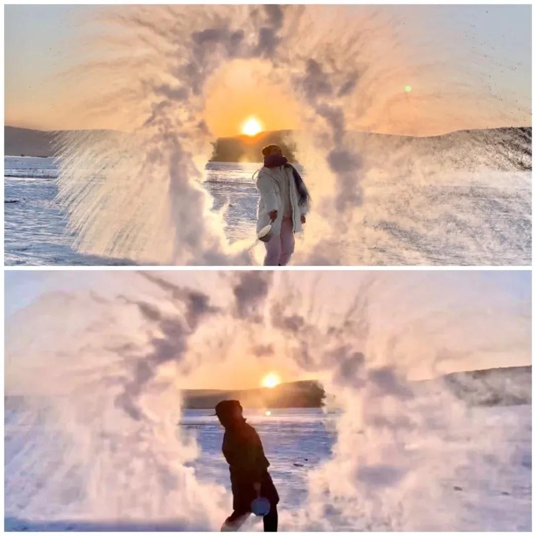 1.泼水成冰要90°以上的水,勺子装水往空中向后撒开,注意在空旷地带,注意安全。