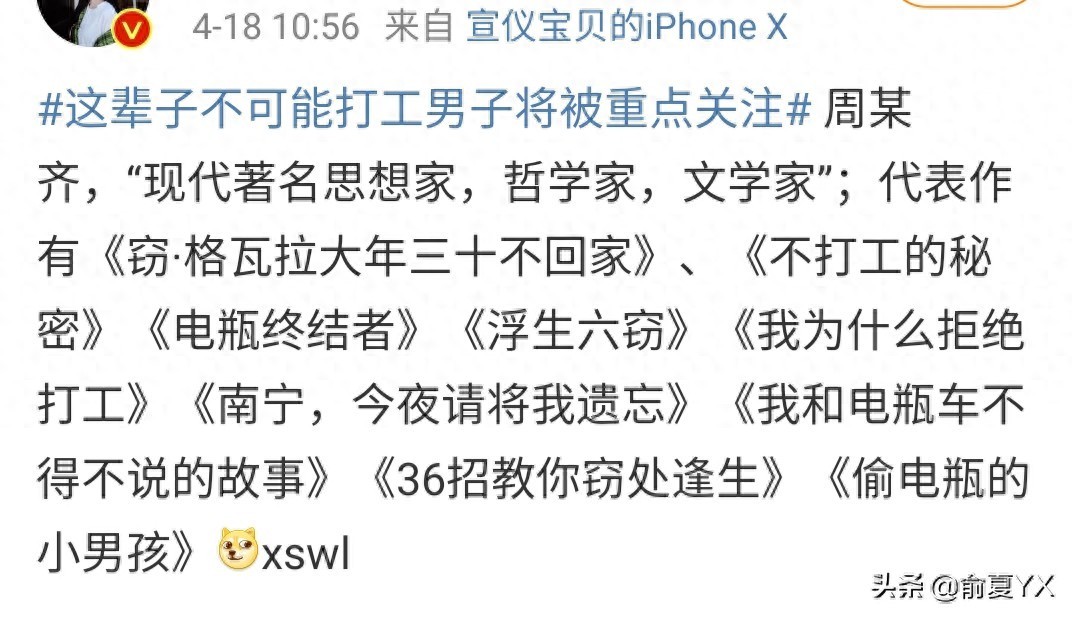 第四次出狱的周某人曾用他的金句逗笑了许多人,让无数社畜听着他的至理名言真是哭笑不得。“打工这方面,打工是不可能打工的,这辈子不可能打工的。”看看,这硬气的样子是多少人比不上的。不过,“真香”可能会迟到,但它一定不会缺席。网络上频频传出周某人在餐厅做服务员的视频,在马路上指挥交通的照片,是真是假,难以辨认,不过这都不重要了。出狱后,能改过自新最好,至少能让周围人放心,不用整天担心电瓶被偷了。