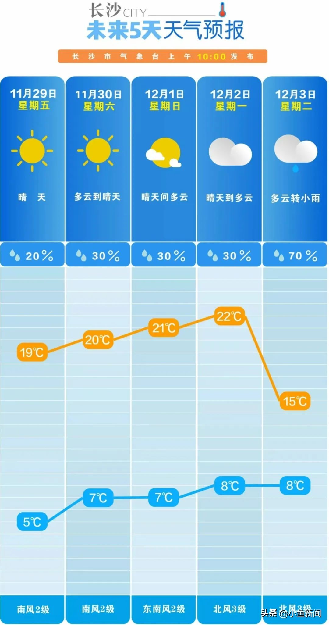 11月30日晚上到12月1日白天,湖南全省多云;南风转北风2~3级;最低气温湘西北5~7℃,其他地区8~10℃;最高气温20~22℃。