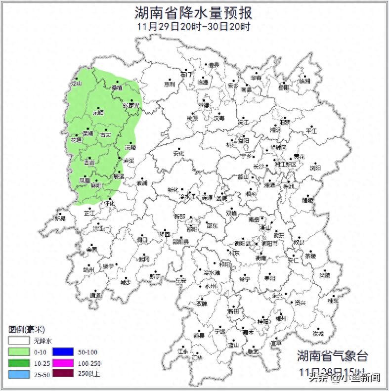 11月29日晚上到30日白天,湖南全省多云到阴天,其中湘西北部分地区有小雨;南风2~3级;最低气温湘西北5~7℃,其他地区8~10℃;最高气温19~21℃。