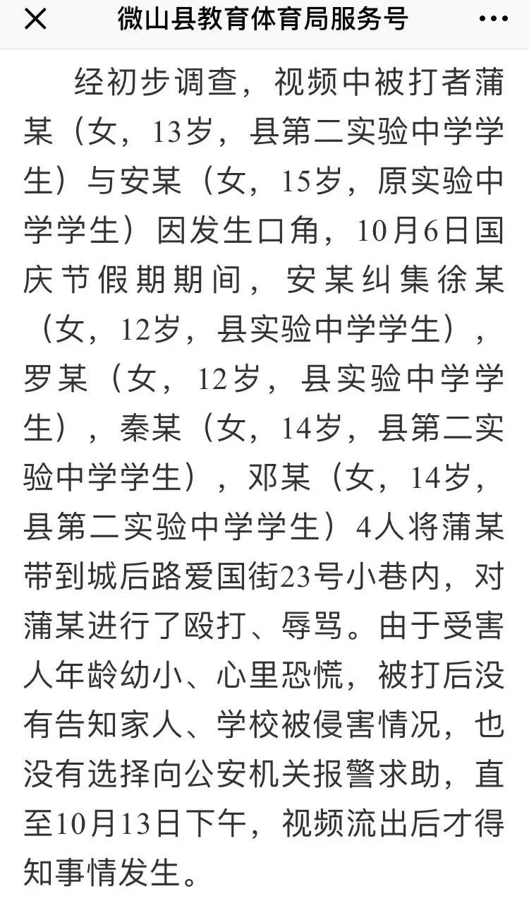 针对网传视频内容,10月14日,山东微山县教育体育局通过其官方公众号发布通报称,经调查核实,蒲某(女,13岁,县第二实验中学学生)因与安某(女,15岁,原实验中学学生)发生口角,10月6日,安某召集徐某(女,12岁,县实验中学学生),罗某(女,12岁,县实验中学学生),秦某(女,14岁,县第二实验中学学生),邓某(女,14岁,县第二实验中学学生)等4人将蒲某带到城后路爱国街23号小巷内,对蒲某进行殴打、辱骂。事后,蒲某由于恐慌害怕,未告知家长及学校,也未选择报警。
