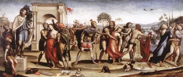 很多艺术家感兴趣于这一题材,不仅因为作品所含有的巨大情感冲突,还因为“抢夺”、“争斗”等可以产生人体“律动”的可能因素。从文艺复兴时期开始就有这个题材的作品出现,索多马的这件横构图作品属于其中一件。