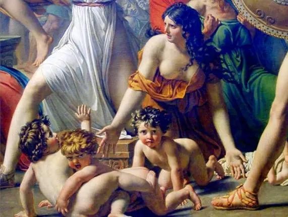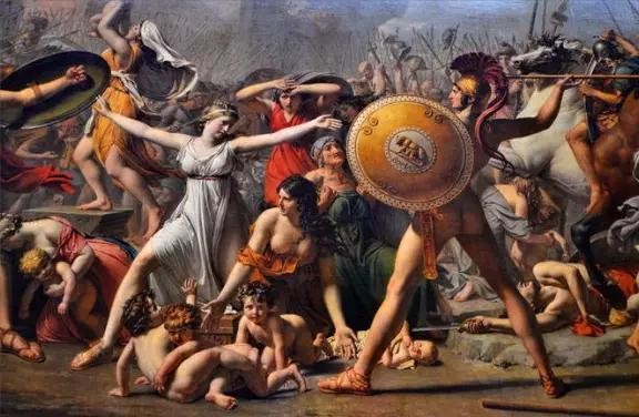 这一题材的另一著名作品来自法国宫廷画家大卫。和前者不同的是,大卫赋予了画作较深的道德主题,把故事中的抢夺场景转换为了和解。画面中间的白衣女子正是赫尔西莉亚,她冲入激战的双方之中,试图阻止战争的继续。赫尔西莉亚宛如古希腊和平女神,她的出现成为了慌乱中的稳定元素,代表了大卫想通过作品表现的道德力量。