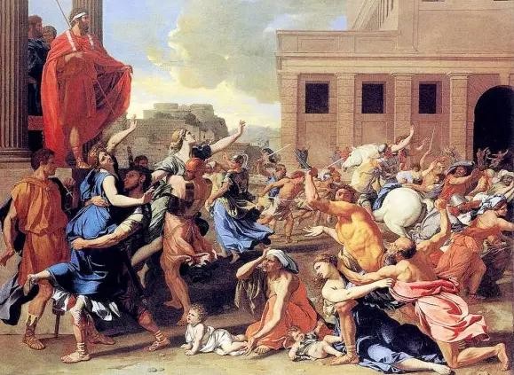 17 世纪,法国古典主义大师普桑就曾两次描绘这一主题。在他的作品中,男子抢夺女人,人群四处逃散,一场惊心动魄的历史场景呈现眼前。画面淋漓尽致的展现了巴洛克时代对动态的美学兴趣。