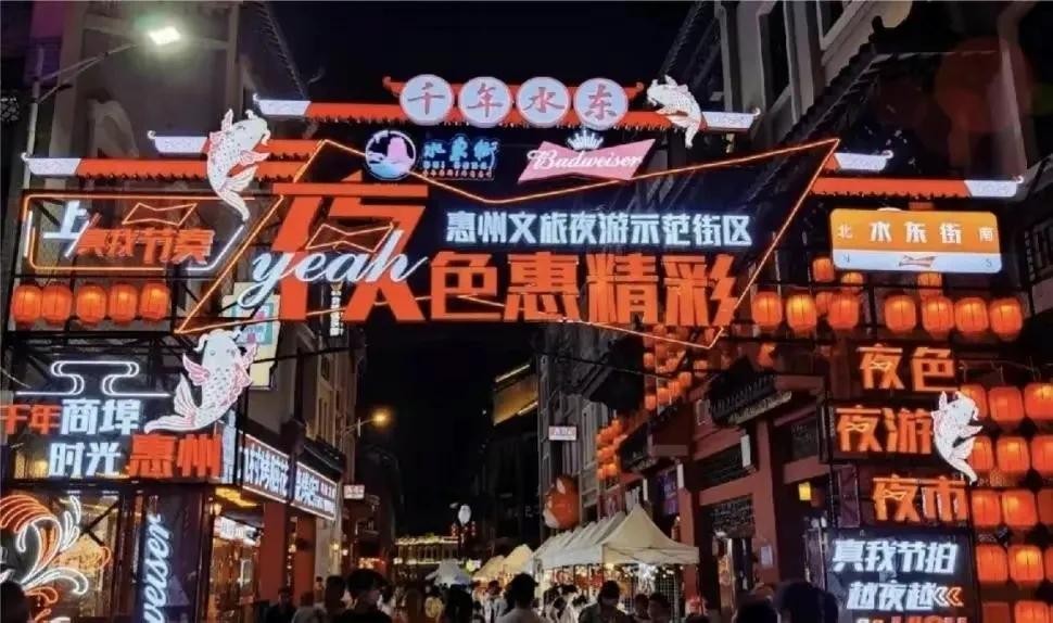 水东街是一条极具惠州古城文化特色的骑楼街,始建于北宋元丰年间,历史上曾是东江流域重要的商品集散地和惠州水陆商贸中心,明清时期成为东江流域最重要的商品集散地之一,民国时期商业发展达到鼎盛。依靠得天独厚的码头水路优势条件,水东街吸引了不少人的目光,今年8月份,国家文化和旅游部公布第二批国家级夜间文化和旅游消费集聚区名单,水东街榜上有名,是惠州首个入选的国家级夜间文旅消费集聚区。