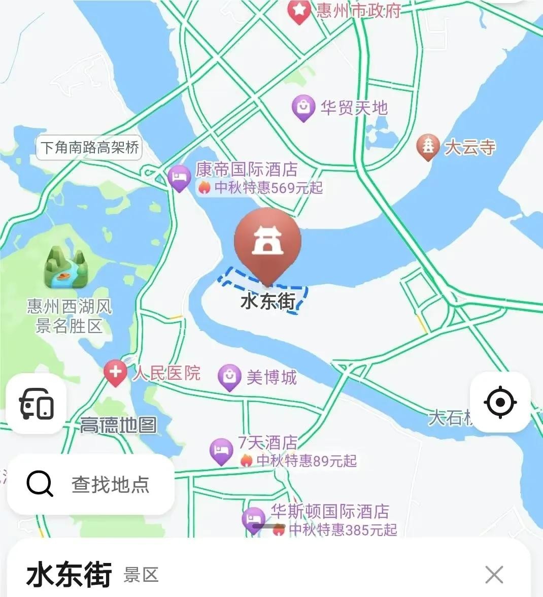 水东街位于惠州老城区东平岛西郊(东江与西枝江交汇处),古街区面积约4万平方米,被东江和西枝江包围,毗邻西湖,与惠州市政府隔江相望。