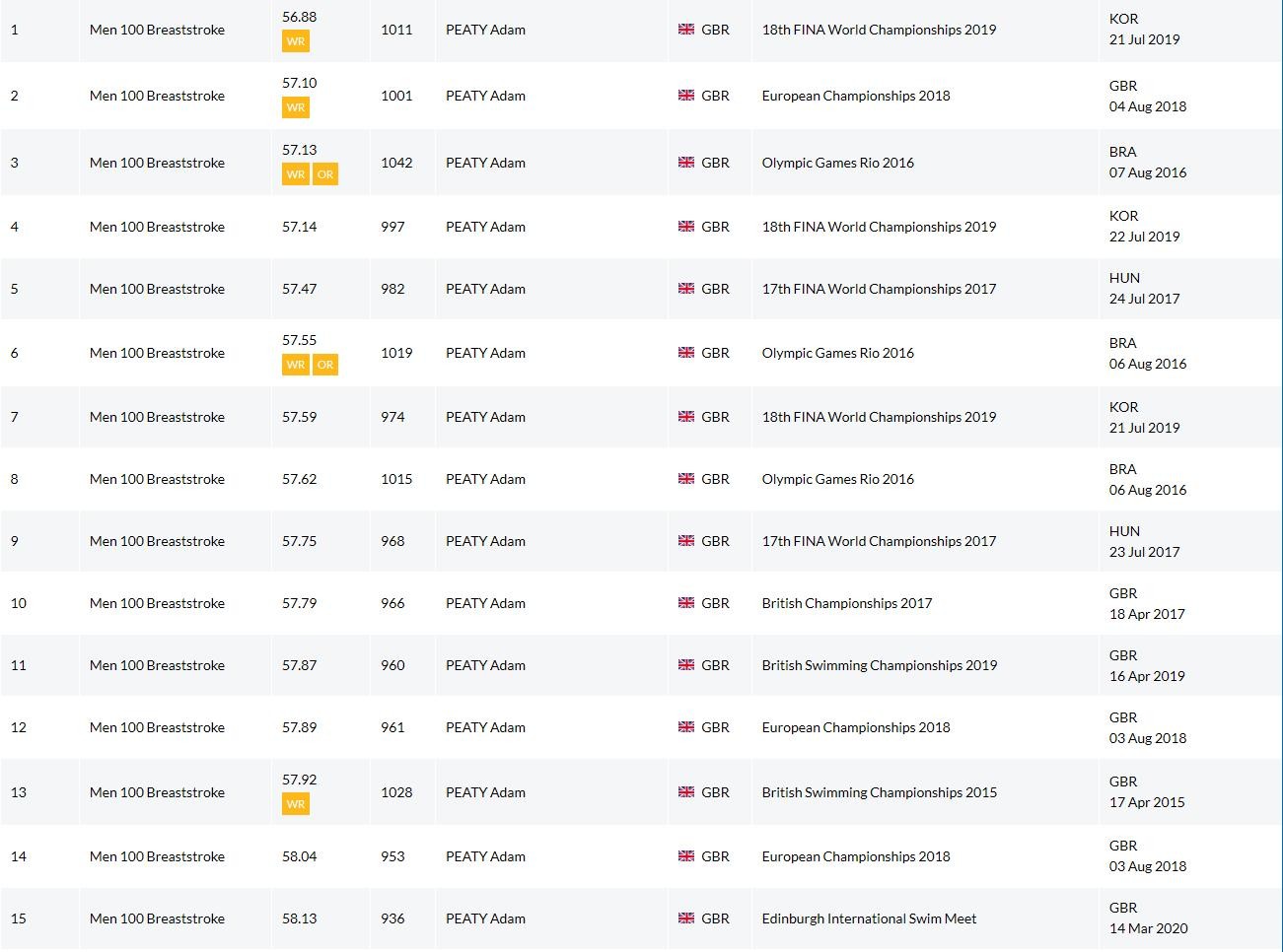 而如果将项目换成100m蛙泳,亚当·皮蒂同样不可阻挡,包揽历史成绩中Top15,同时占据历史Top50中的29次。最好成绩的跨度令人震惊,由58.68s提高到了56.88s。