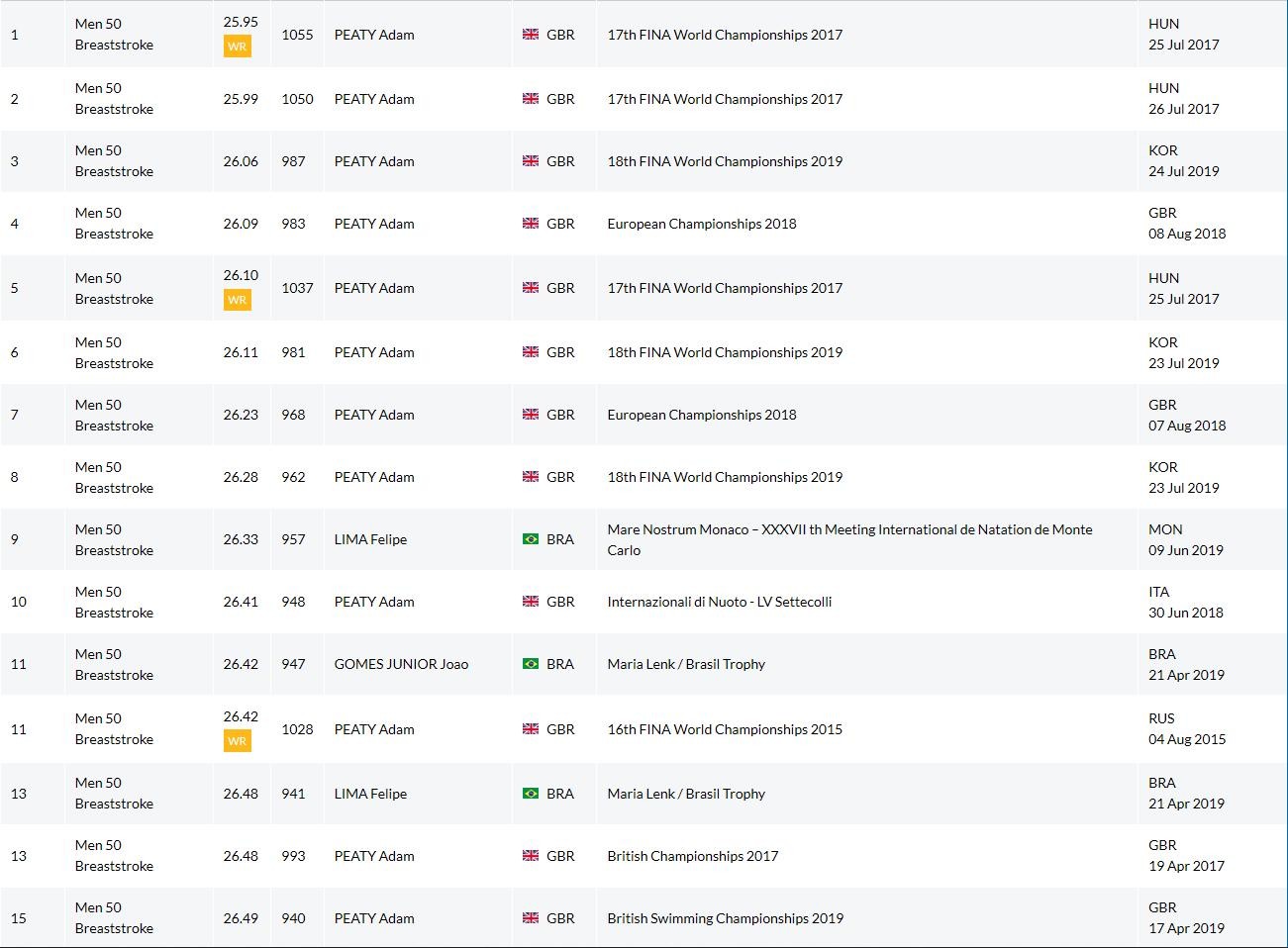 从2014年至今,亚当·皮蒂几乎包揽了所有重要赛事的50m和100m蛙泳冠军,世锦赛三连冠、奥运会金牌如探囊取物,除了荣誉的收割,更令人惊叹的是他竞技水平的提高,50m蛙泳两次游进26s(2017年世锦赛50m蛙泳半决赛和决赛),100m蛙泳游进57s,而这些似乎还不是尽头,截止目前,50m蛙泳成绩历史Top15中亚当·皮蒂占据了其中的12次,如果拓展到Top50,他占据的次数高达31次。其最好成绩由26.62s提高到了25.95s。