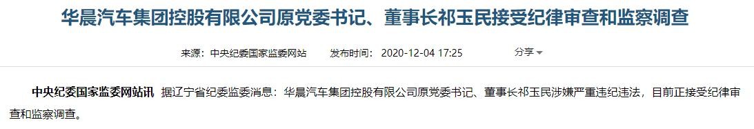 2020年12月份,在华晨集团正式进入破产重整程序15天后,祁玉民被带走调查。网站发布消息称:华晨汽车集团控股有限公司原董事长祁玉民目前正在接受调查。