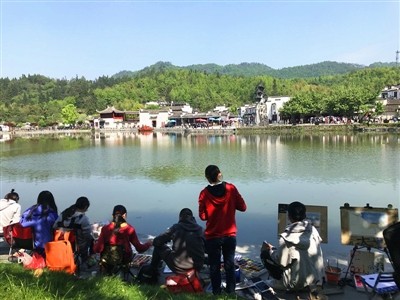 4月25日,大批美院师生在西递明经湖边写生创作。陈露/摄。