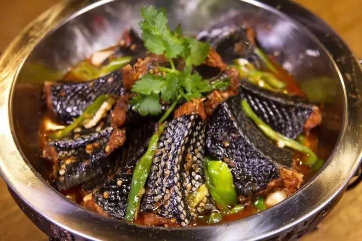(2)锅内加水烧开下入蛇肉飞水,另起锅加红油,下入辣妹子酱、豆瓣酱、蚝油,然后再下入蛇段煸炒,把口味料及盐、味精、鸡粉、老抽、干辣椒放入高压锅内压8分钟取出,加小红椒收汁装盘,放少许香菜点缀即可。