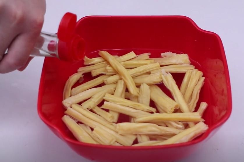 然后我们再滴几滴的白醋,白醋可以让腐竹泡发出来更好吃,更有韧性。