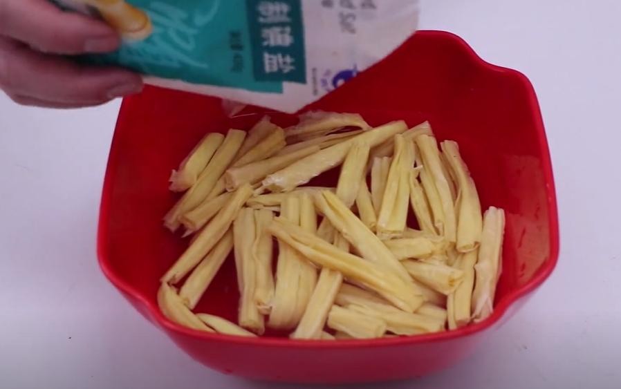 接下来我们在里面加入食盐,食盐可以让腐竹快速的吸收水分,泡发的时间会大大的缩短,会让腐竹快速的泡发开,