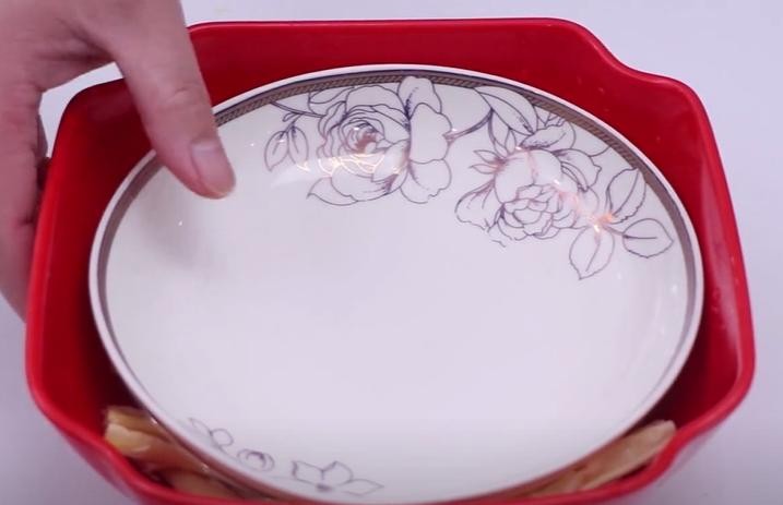 接下来我们把盘子倒扣在里面,这样能够让腐竹快速的吸收水分,