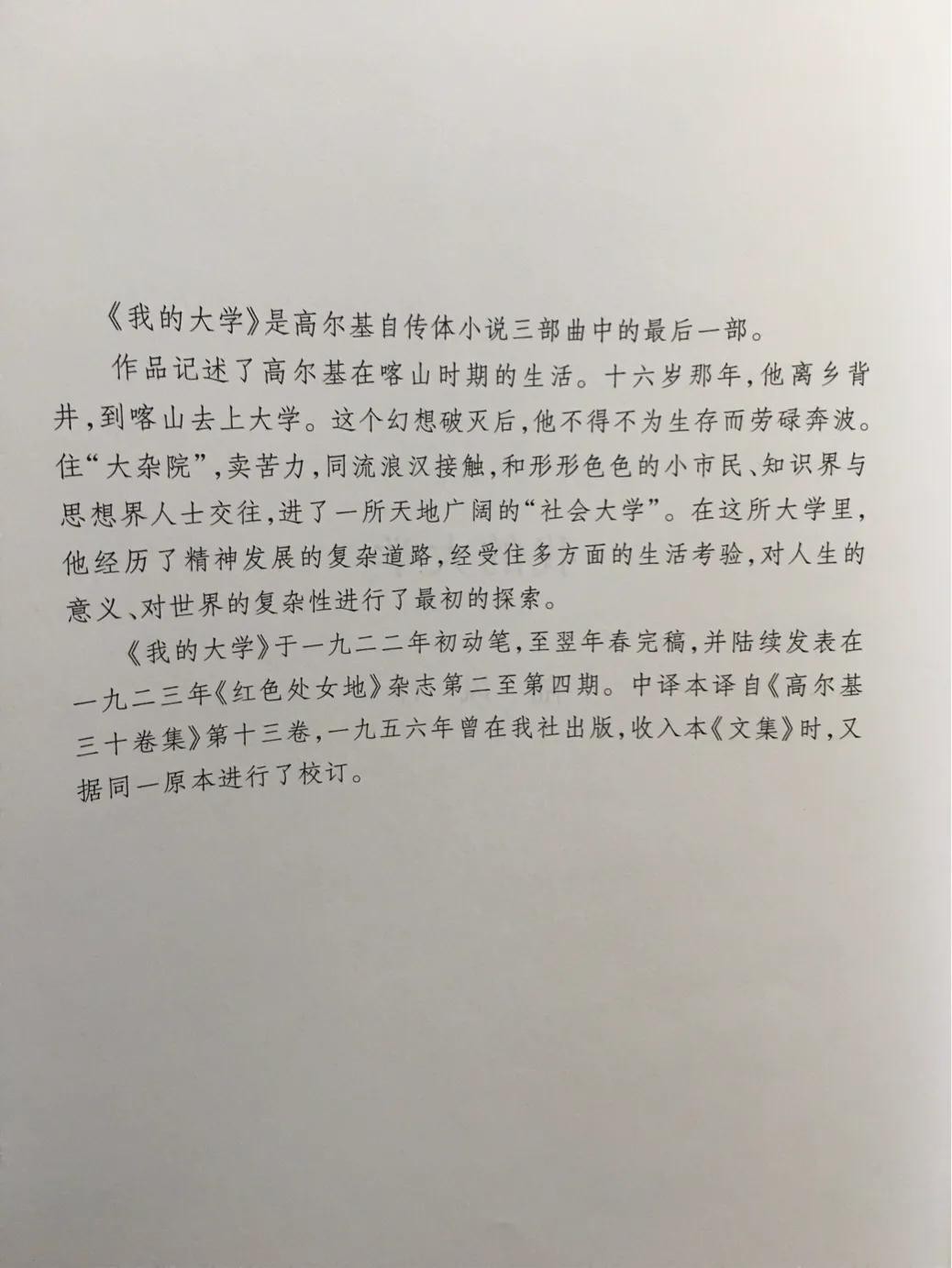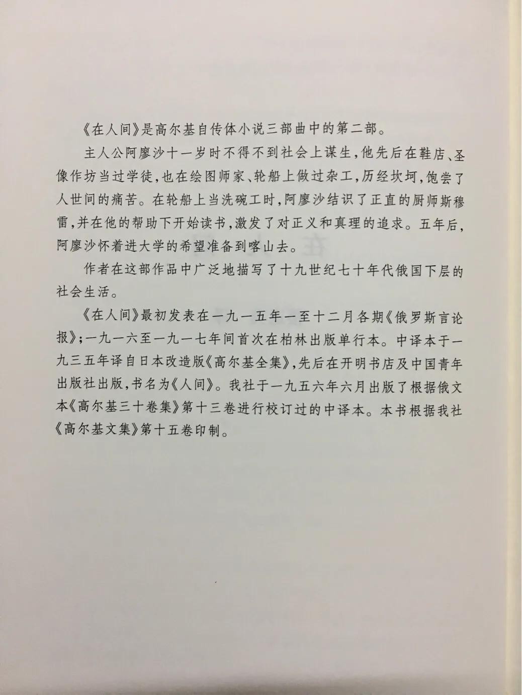 高尔基是从小学时代就知道的伟大文豪,对于他的自传体三部曲,耳熟能详,以前上学时读过漓江版刘引梅的《在人间》译本。这次系统读人文社《高尔基文集》版的自传体三部曲,分别是刘辽逸、楼适夷、陆风翻译的,收在文集15、16卷。高尔基具备一种特殊的表现力,芸芸众生,复杂多变,他往往只需三言两语,就把人物刻画得栩栩如生,情节的推移,靠转换对话或者叙述推进,根本感受不到他在跳跃,感觉极其自然。他如实描写俄罗斯十九世纪后期的巨幅画像,生命力顽强,深沉广阔,令人惊叹。高尔基几乎没有上学,全靠在社会底层打拼,文字表现力那样强大,真是天才文学家。骨子里有一种俄国人的诗意和表现力。