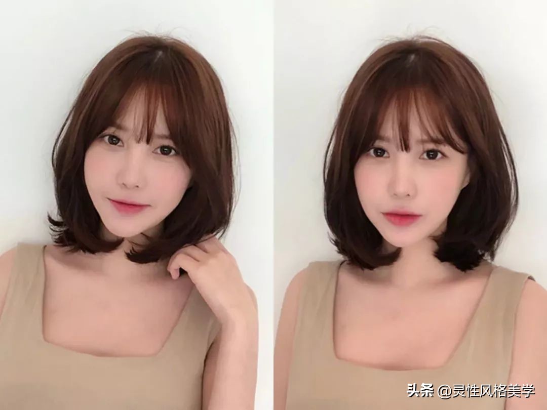 2、齐肩锁骨短发+法式刘海,超级减龄又不失少女范的短发发型,修剪过的头发,有些层次感,微微内扣起来的发尾,和薄碎的法式刘海搭配一起,很显脸小,给头发染上一个栗子棕的发色,满满的质感又能衬托出白肤色。