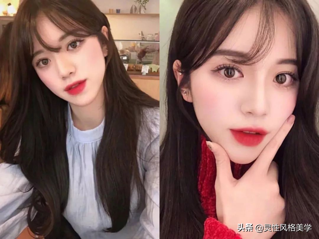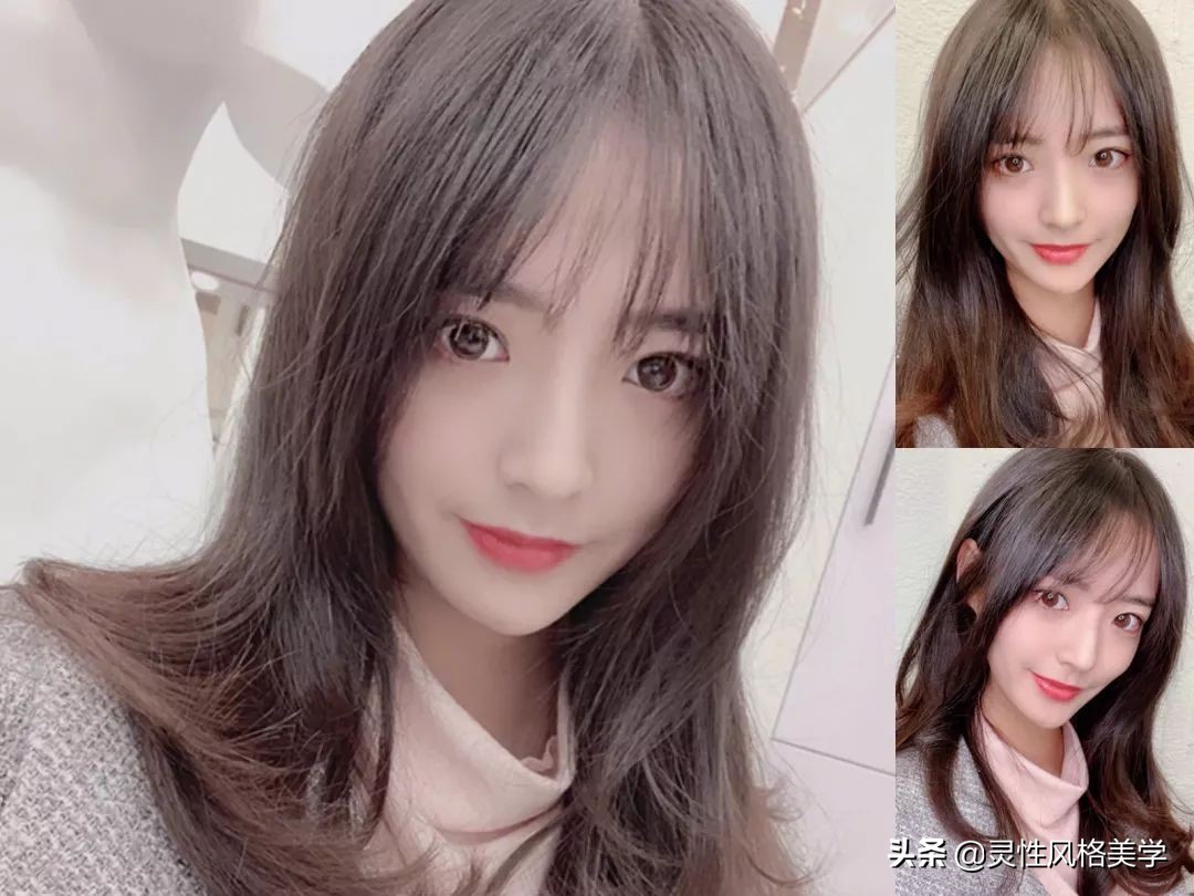 6、任何脸型都适合的法式刘海发型,头发是韩式蓬松气垫烫,发尾有些S型,还带些外翘感,而刘海采用的是法式的八字刘海,真的很适合大脑门、脸大的女生。头发染上时尚自然的黑茶色,肤色都白了好几度呢。