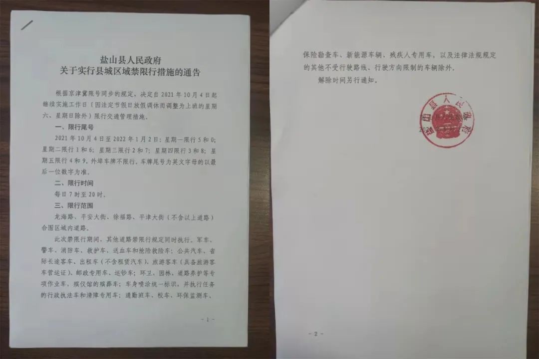 盐山县人民政府关于实行县城区域禁限行措施的通告