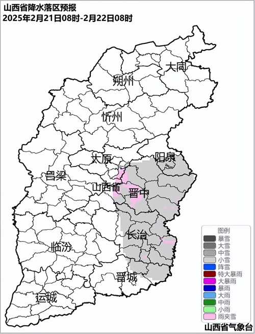 北中部多云,南部阴天转多云,中部局部和南部大部分地区有小雪或雨夹雪,南部局部地区有中雪,运城局部地区有小雨。