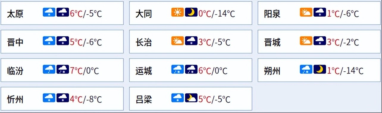 北部多云间晴天,中南部多云,晋中、长治的大部分地区和阳泉、晋城的部分地区有小雪或雨夹雪。