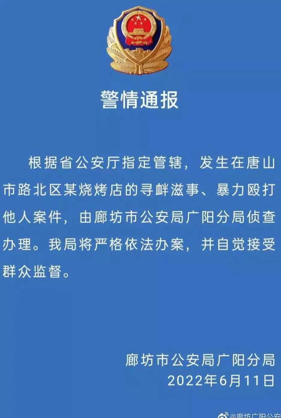 国人义愤填膺的唐山“烧烤店事件”犯罪分子已全部到案,为防当地保护伞,河北省公安厅指定廊坊市公安局广阳分局负责侦办。