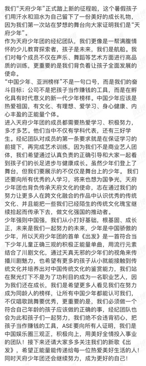 8月21日,“天府少年团”所属公司发文回应质疑,强调公司不是把孩子当作赚钱的工具,而是在孵化具有时代意义的新一代少年榜样。