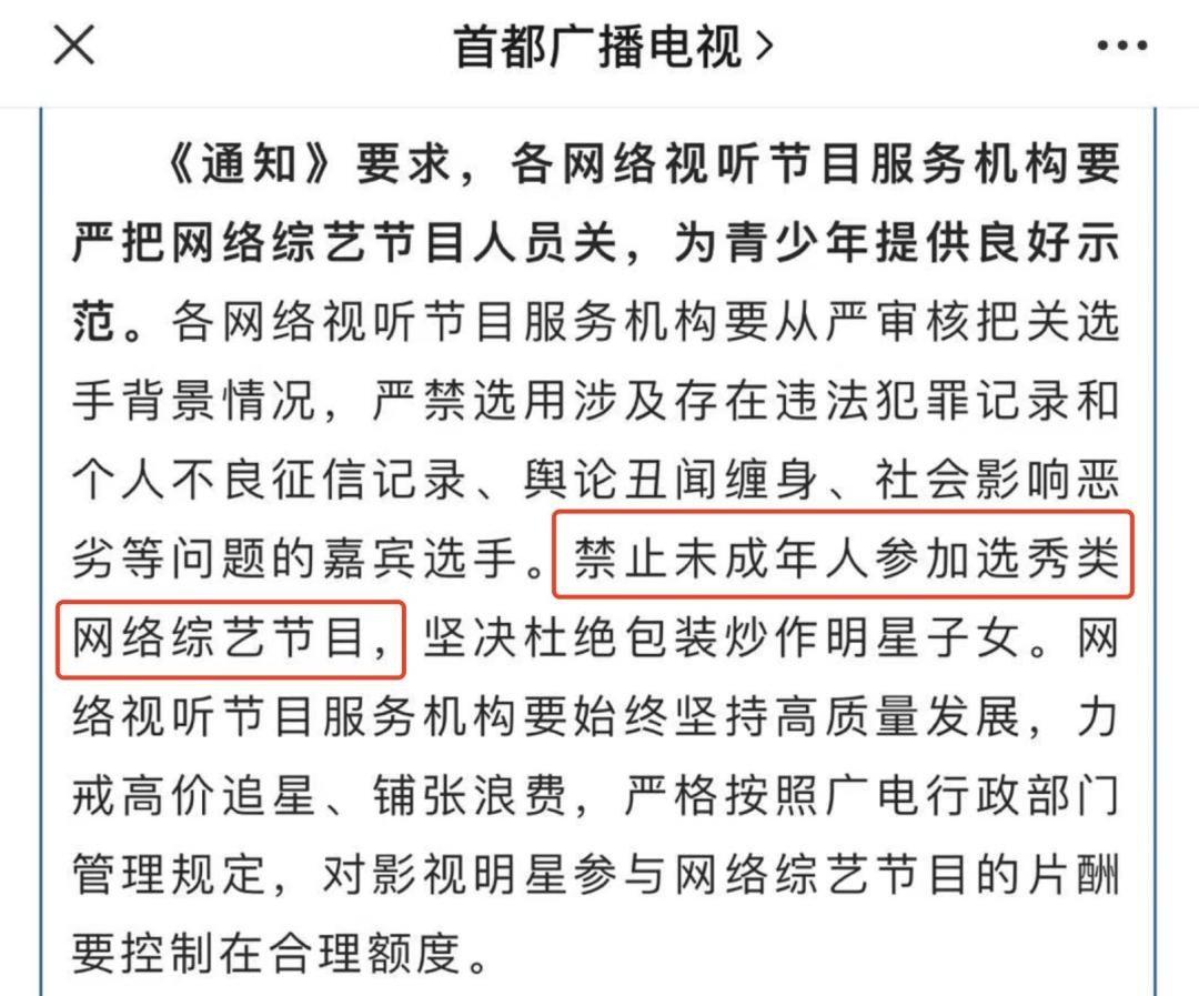 5月10日,北京市广电局也发布通知,各网络视听节目服务机构要严把网络综艺节目人员关,为青少年提供良好示范。禁止未成年人参加选秀类网络综艺节目,坚决杜绝包装炒作明星子女。
