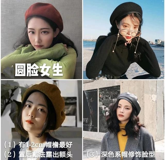 而对于圆脸的女生,在选择贝雷帽来佩戴时,建议选择有1-2cm的帽檐最好,佩戴的方式是往后搁置的戴法,露出额头来。还有帽子的颜色选择深色比浅色更加修颜瘦脸。