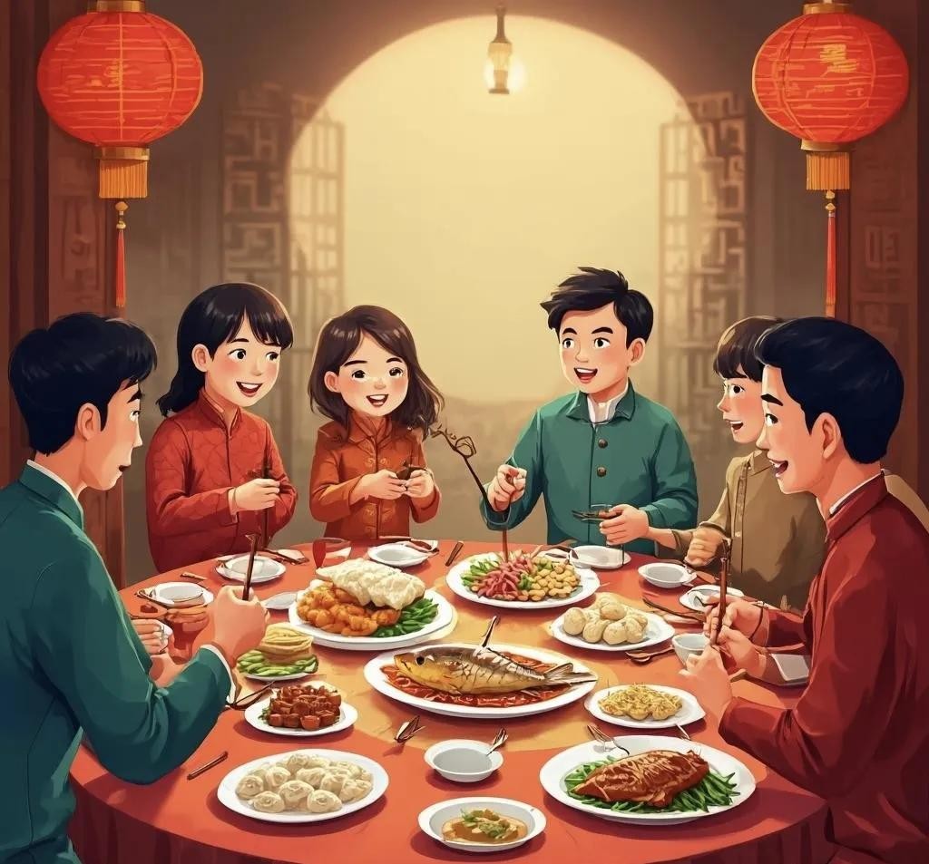 除夕之夜,家人围坐在一起吃团圆饭,是过年期间最重要的一件事。团圆饭的餐桌上,鱼、鸡、鸭、肉等美味佳肴应有尽有,寓意着年年有余、团圆美满。在这顿饭桌上,长辈们讲述着过去一年的故事,晚辈们倾听着教诲,共享天伦之乐。
