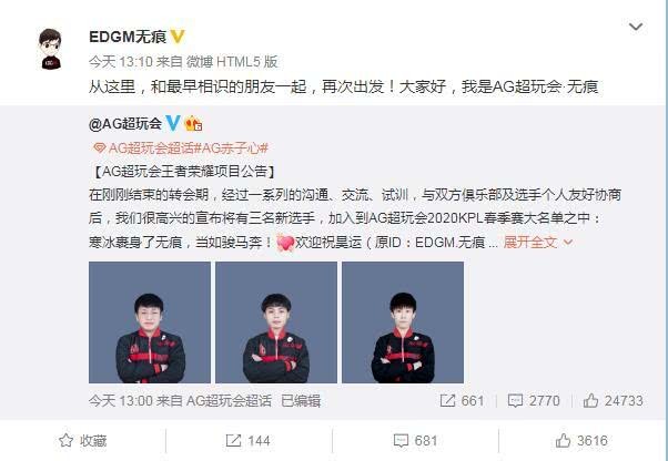 进入2020年,整个kpl也是新的备战阶段,而在新赛季之前,转会期也是闹得轰轰烈烈,各家战队也是纷纷把自己心仪的选手拿下。其中最受关注的除了久诚恐怕就是无痕了,作为KPL的老将,在仙阁时期,就经历夺冠,降级,来到EDGM之后,也是登上过总决赛,与冠军擦肩,如今以自由人的身份加入AG超玩会,也是让人无限感慨,兜兜转转,又回到最初的原点,从对手到队友,无痕也是和老帅并肩作战,网友纷纷呼吁:来个露娜可好!