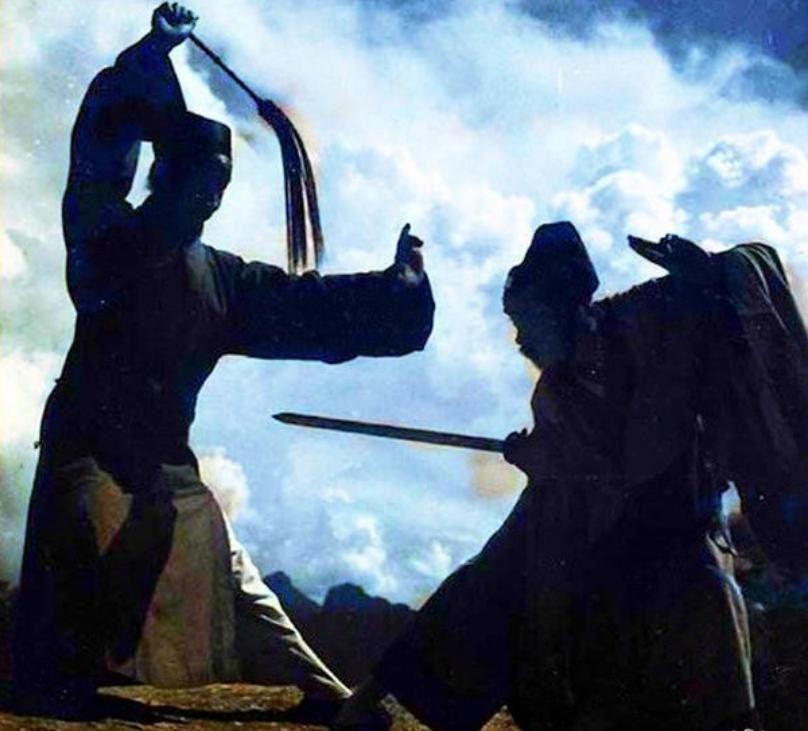 照片上有两个道士在华山打武术,两个人站在华山的山顶,乍一看像仙境一样的山上的白云,很多道士在华山修行也不足为奇。 华山也被称为道教的"第四洞天"。 画面右边的道士拿着长剑,左边的神父拿着佛尘,佛尘叫做抛子,捆住兽毛、麻、马毛尾等,捆在长木上,为了驱蚊,常见菩萨和老人拿着佛尘,道家中最常见的是太上老君,他总是手持佛尘