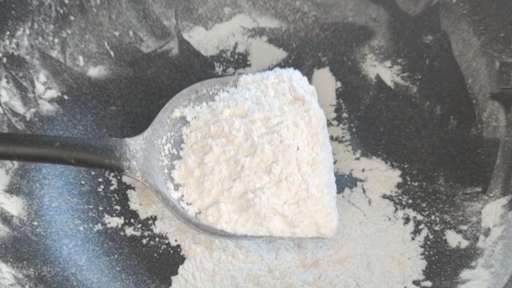 6.重新起锅,锅中不用放油,加入一大勺面粉,开小火把面粉炒至微黄,盛出来备用。