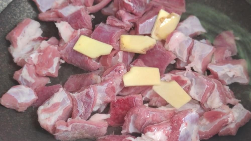 2.锅中烧水,倒入切好的牛腩,先给它焯一下水,再加入适量的姜片和料酒去腥。开大火把水烧开,水开后打掉上面的浮沫。牛腩焯好水后捞出来,用温水清洗干净,沥干水分后放入小碗中备用。