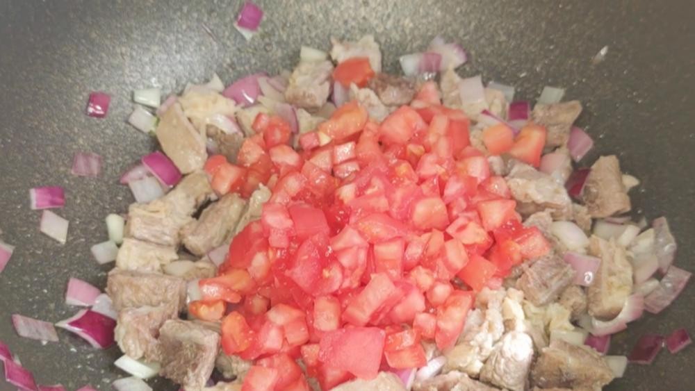 4.把锅烧热,加入一块黄油,搅拌融化后放入切好的洋葱丁,开小火慢慢煸炒出香味。然后倒入焯好水的牛腩,翻炒两、三分钟。把牛肉的水分炒干,接着倒入西红柿丁,继续给它翻炒。把西红柿的汤汁翻炒出来,加入一勺番茄酱,翻炒均匀,加入了番茄酱颜色更加的好看,一会炖出来的汤汁也会更加浓郁。