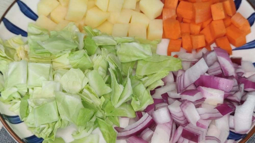 3.洋葱半个切成丁;胡萝卜半根切成丁;去皮洗净的土豆一个切成丁;半个清洗干净的包菜切成块;西红柿一个,先打上花刀,然后用开水烫一下,把西红柿的皮撕掉,然后把去皮西红柿改刀切成丁。