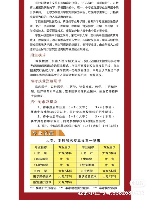 学校主要开设医药类、护理类专业升学班,春考升学专业主要涵盖护理、助产、临床医学、口腔医学、中医学、针灸推拿、药学、中药学、医学检验技术、医学影像技术、康复治疗技术等十余个医护类专业。