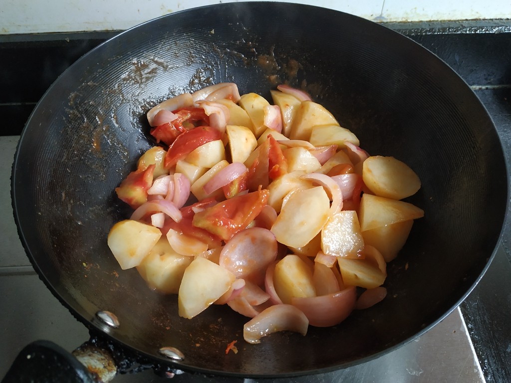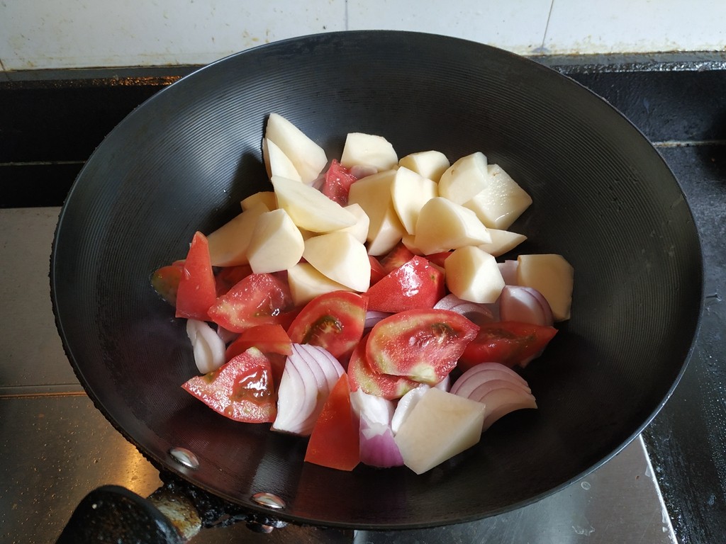 9.锅里油热,放入土豆,洋葱,番茄,