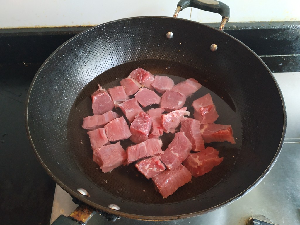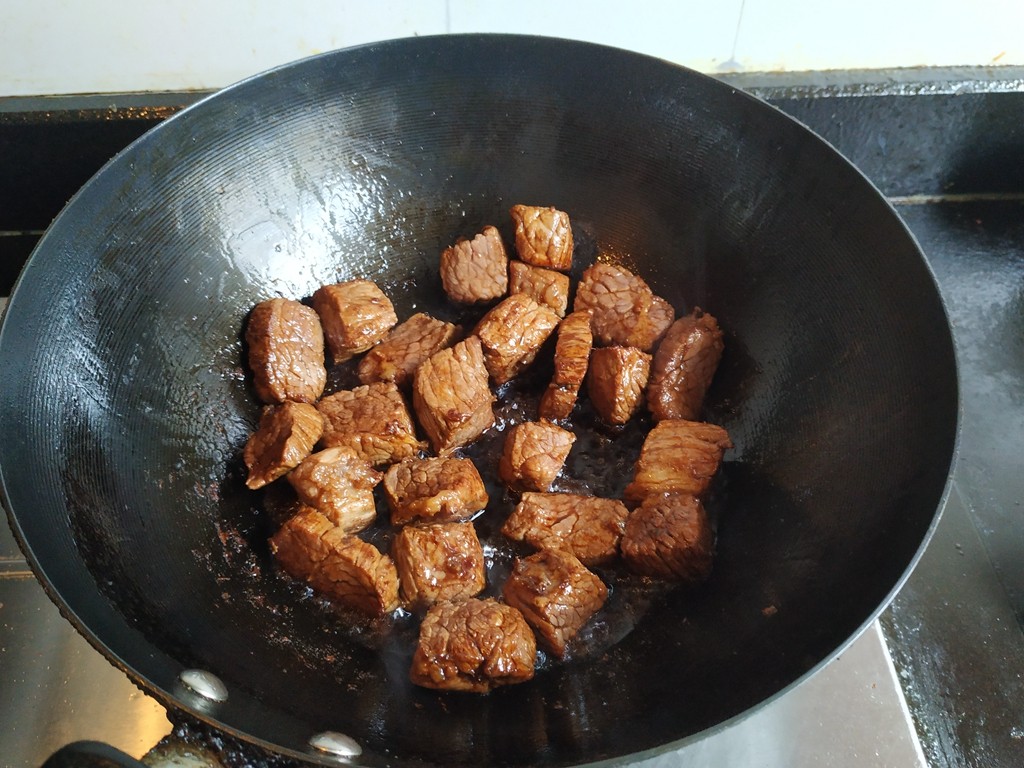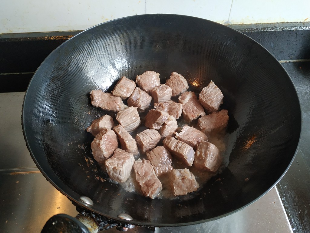 3.锅里油热,放入牛肉煸炒至转色,