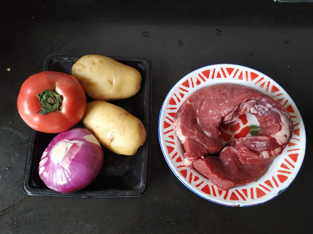 用料;牛肉550克,土豆2个,洋葱1个,番茄1个.(我们这里现在牛肉50元1斤)