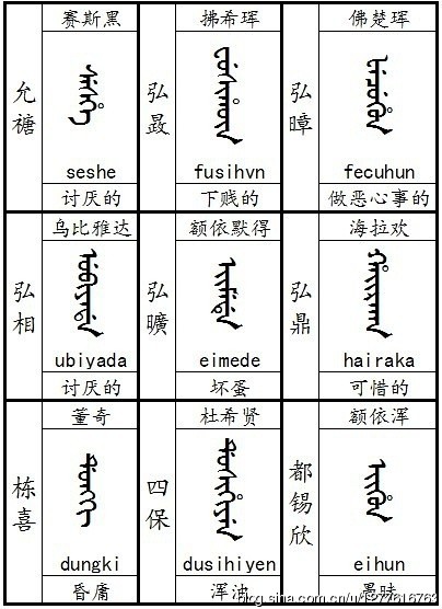 过去,对于赛斯黑一词有过很多说法,民间传说是“狗”的意思,其实并不是这样的。赛斯黑,即“seshe”,是满语中的一个常用词汇,意义为“厌烦、讨厌”。由此可见世宗对于允禟的态度。而在当时,宗人府还给允禟的儿子们改了名字,均是贱名,见下图。
