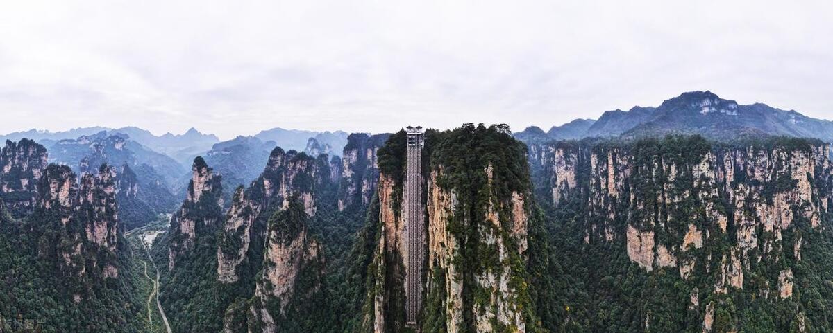 百龙天梯:位于张家界核心景区武陵源袁家界,垂直高差335米,运行高度326米,由山体内部的坚井和着贴山体的井架组成,有三台电梯并排运行,每台都是由全透明玻璃构成,它是世界上最高的户外电梯,曾还载入吉尼斯世界纪录。