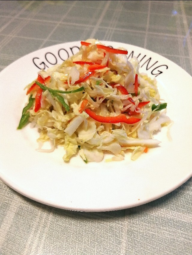 第二道小菜:凉拌青萝卜丝,把青萝卜清洗干净,切成细丝,再切几根红辣椒丝和香菜段,和萝卜丝混合在一起,给上面撒上适量盐,用手揉一揉,然后装盘。
