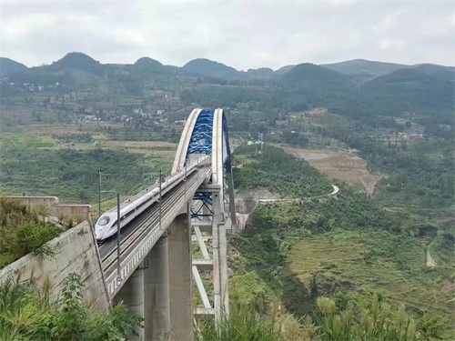 成贵客专鸭池河大桥,是成贵高铁贵州段段管内的一座高速铁路双线特大桥。桥面轨道类型为有砟轨道,设计行车速度为250km/h。