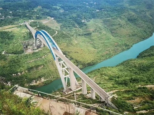 鸭池河特大桥是世界上跨径最大的中承式空腹钢混结合提篮拱桥,也是跨径最大的高速铁路同类型桥梁。大桥桥面与水面距离为434米,高度排名世界第五位。