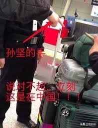 传媒报道,据网友爆料,当日孙坚在机场办登机时,遇到一个因迟到没有赶上飞机而对中国破口大駡的外国游客,孙坚听见后立刻就上去跟他理论,告诉她这是中国并且要求道歉。