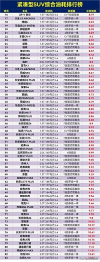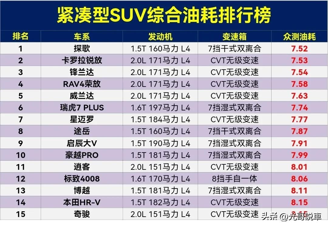 别乱买,紧凑型SUV油耗排行,探歌夺冠,奇骏第15,CR-V第22名。