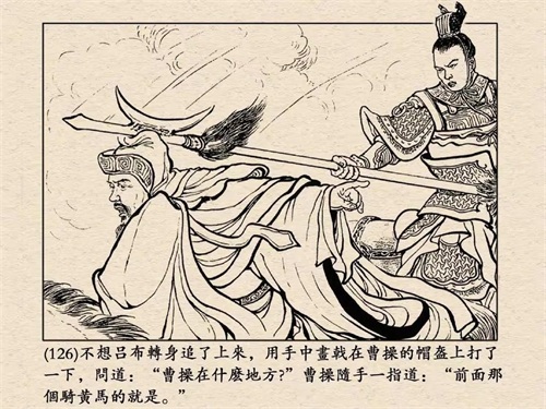 曹军大乱,曹操与典韦失散。曹操在火光中撞见吕布,以手掩面,纵马竞过。吕布拍马赶来,将戟于曹操盔上一击,问:曹操何在?曹操“一阳指”:前面骑黄马的是他。吕布弃了曹操,纵马向前追赶。最后老曹靠着“一阳指”走上了“阳关道”,躲过了这场人生浩劫。