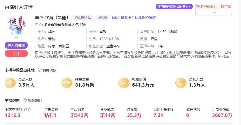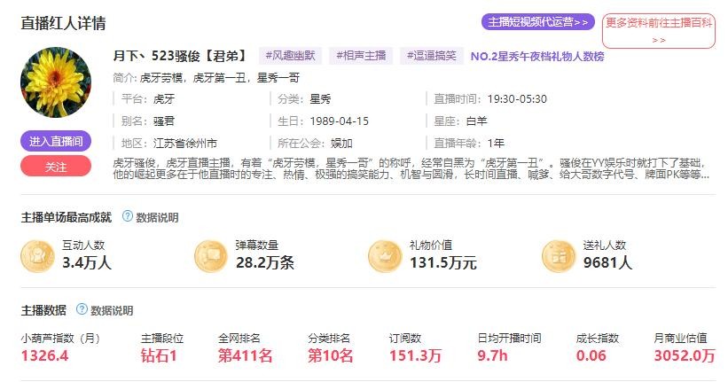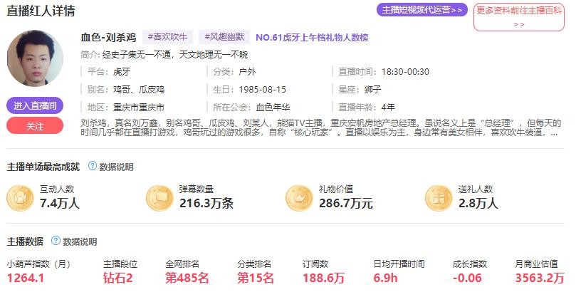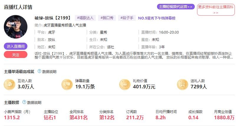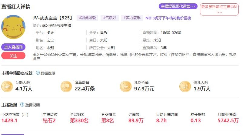 这两年,各个平台用头榜数据比较多。不过小葫芦数据的东西也是很全面,还有一条主播商业估值的数据。