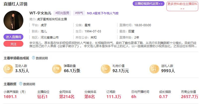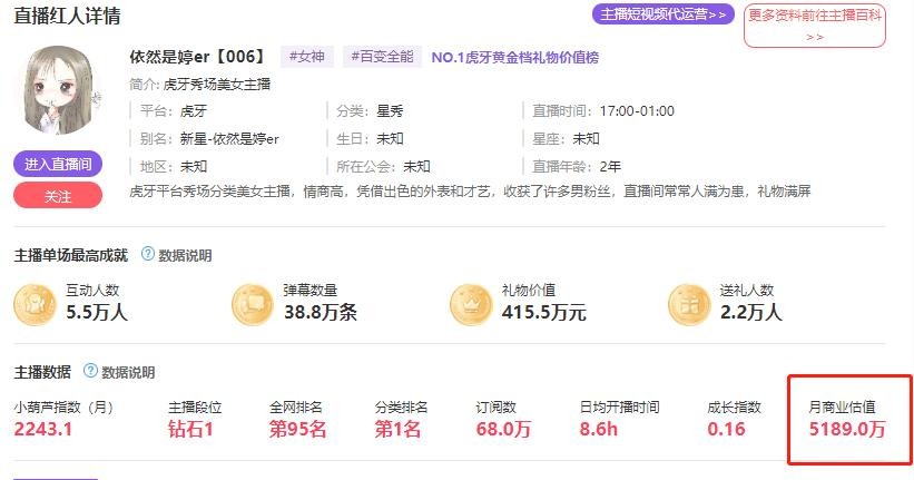 这个商业估值,应该是根据人气,排名,开播时间。以及营收综合出来计算的。